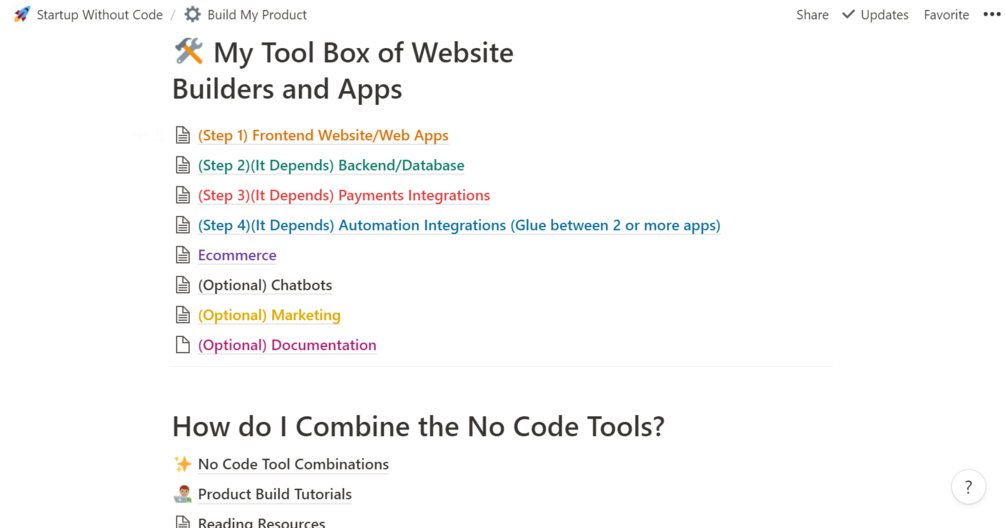 An actionable & resource-packed dashboard and directory on how to build and test your MVP without code. It includes curated resources of no-code tools, a business plan template, sales funnel techniques, launch day best practices, and more! It also lists 150+ directories to submit your startup to gain users for your bootstrapped business. It'll save you hours of research.